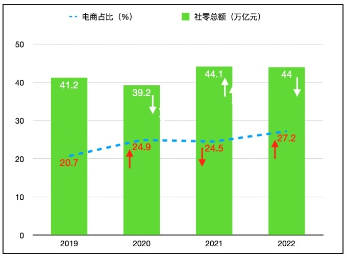 2021年是疫情期間恢復(fù)較快的一年,當(dāng)年44.1億萬(wàn)億元的社零總額基本收復(fù)失地,明顯超過了2019年的41.2萬(wàn)億元。同年電商贈(zèng)速繼續(xù)降至12%,而這年電商的滲透率不增反降,從2019年的24.9%將低到24.5%。