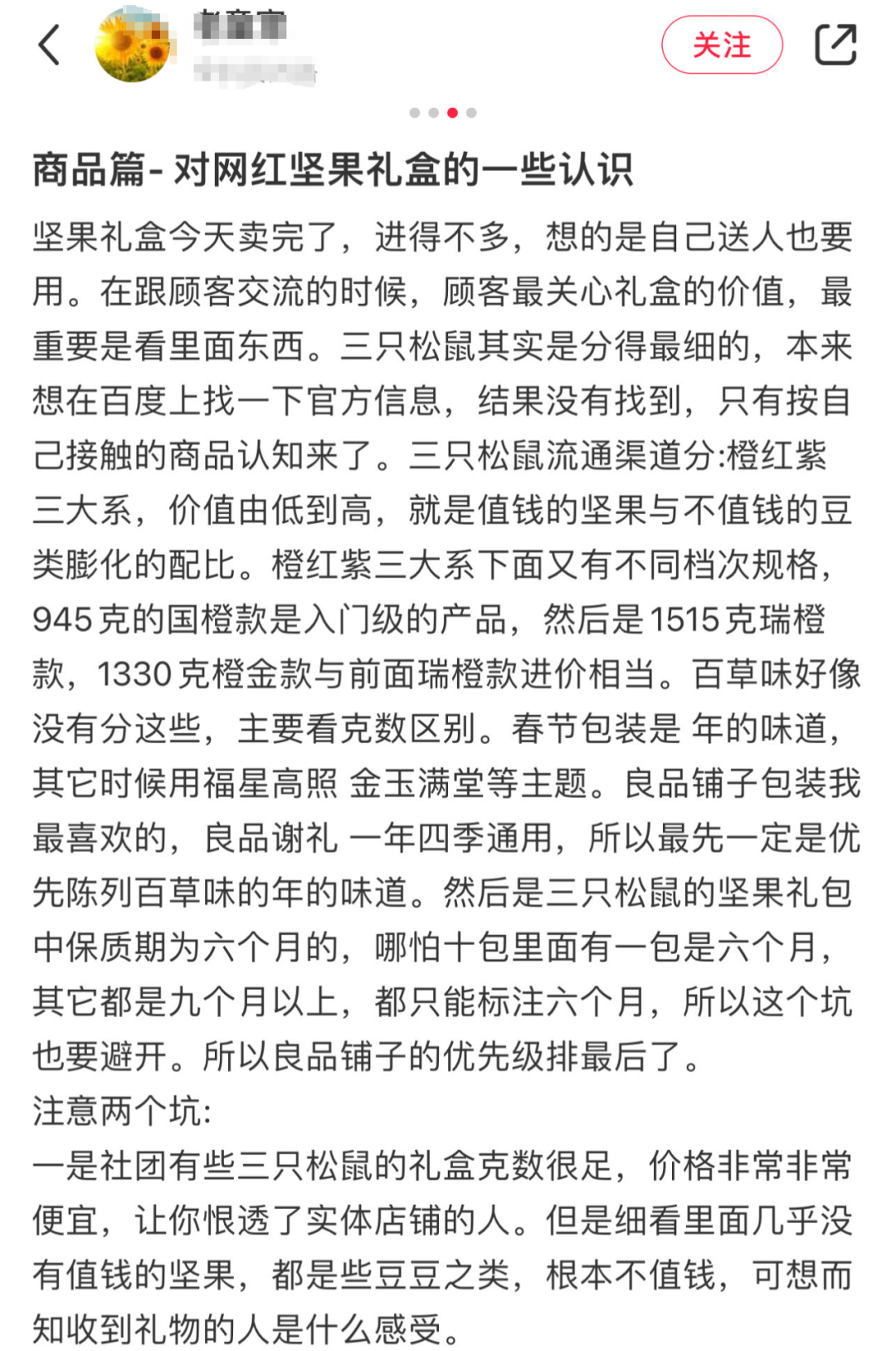 在小紅書上,可以看到一些零售商對(duì)于三只松鼠禮盒紛繁復(fù)雜產(chǎn)品體系的無奈控訴:“產(chǎn)品太多,自己也分不清楚,還是請(qǐng)消費(fèi)者買的時(shí)候詳細(xì)查看包裝”。