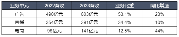 而內(nèi)循環(huán)廣告主要看快手的整體ROI表現(xiàn),目前主要靠食品飲料和快消品拉動(dòng),2023Q4活躍營(yíng)銷客戶規(guī)模同比增長(zhǎng)了160%。這幾年經(jīng)濟(jì)下行壓力較大,品牌主在市場(chǎng)營(yíng)銷方面的舉動(dòng)往往會(huì)更加理性節(jié)制,而ROI為正的投流渠道往往會(huì)逆市放大。據(jù)此我們可以推斷, 說(shuō)明站內(nèi)還有不錯(cuò)的流量紅利 。但是也需要留意賺錢效應(yīng)帶來(lái)的競(jìng)爭(zhēng)是否會(huì)進(jìn)一步加劇。