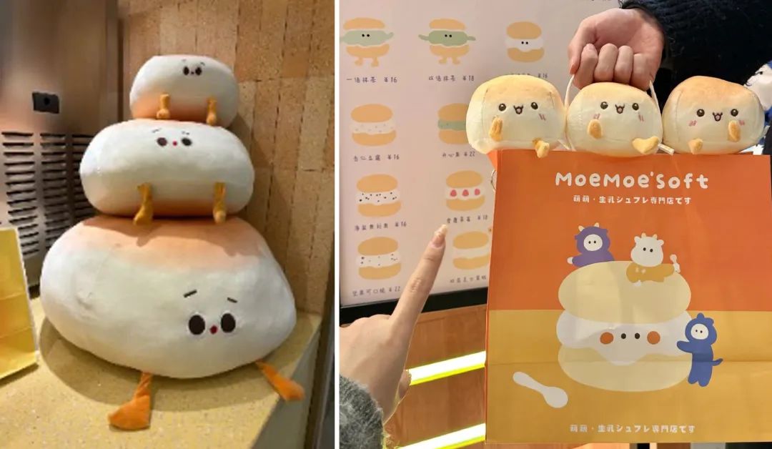 此外,全國各地都有類似的門店涌現(xiàn),裝修相似,產品相似,連門口疊在一起的“舒芙蕾娃娃”都一樣,像長沙,就有一家叫MoeMoe'Soft 的店,也專做生乳舒芙蕾。