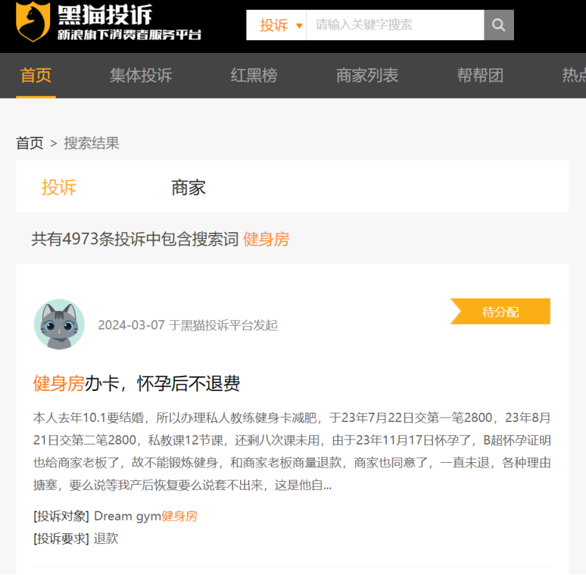 在黑貓投訴搜索關(guān)鍵詞“健身房”,相關(guān)投訴有4973條。其中大部分投訴內(nèi)容都為健身房拒絕退款、退卡收手續(xù)費(fèi),健身房攜款潛逃等等。