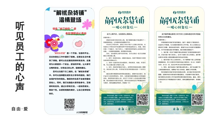 所以2024年我們公司做了一個(gè)“解憂雜貨鋪”,為什么要做這個(gè)?因?yàn)榧押鸵欢ㄊ桥囵B(yǎng)一個(gè)敢于說真話、真誠的環(huán)境,我們要讓員工看到我們的改變,感受到這樣的一個(gè)環(huán)境。做這個(gè)解憂雜貨鋪,目的是聽到員工的心聲,包括意見建議,好的、不好的,都可以。我只是截了兩個(gè)圖片,這是我們員工在“解憂雜貨鋪”里袒露的心聲,我們給予了真誠的回復(fù)。