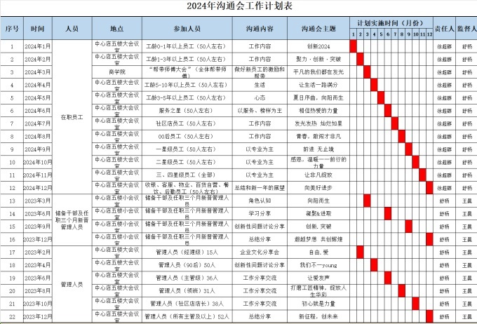 給大家展示一下我們2024年的一個(gè)計(jì)劃表,這是我們部門做的溝通會(huì)的計(jì)劃表,在2023年12月底我們就確立了2024年要溝通的方向是什么,目標(biāo)是什么。我們也看到胖東來的員工之家非常的高大上,我們企業(yè)也為員工設(shè)置的了員工之家,雖然布置很簡(jiǎn)單,但是員工在這里感覺到很喜歡、很安靜,也很放松。因?yàn)榱闶燮髽I(yè)的員工是非常辛苦的,所以有這樣一塊地方給員工休息,他們都感到非常幸福。