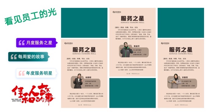 所以基本上我們部門現(xiàn)在做的大量的工作就在這里,特別是今年,今年因?yàn)殡S著我們理念的改變,還有一些機(jī)制的提升,其實(shí)招聘基本上沒有壓力了,我們把更多的工作重心放到了看到員工身上的光,真正的去看到我們一線員工身上的閃光點(diǎn),去挖掘佳和人的故事。