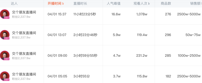 東方甄選也是如此,其在淘寶并沒有像抖音那樣常態(tài)化日播,3月只播了25天,且自3月15開始,其開播時(shí)間調(diào)整到了下午4點(diǎn),直播時(shí)長遠(yuǎn)低于抖音16個(gè)小時(shí)以上的日播時(shí)長。