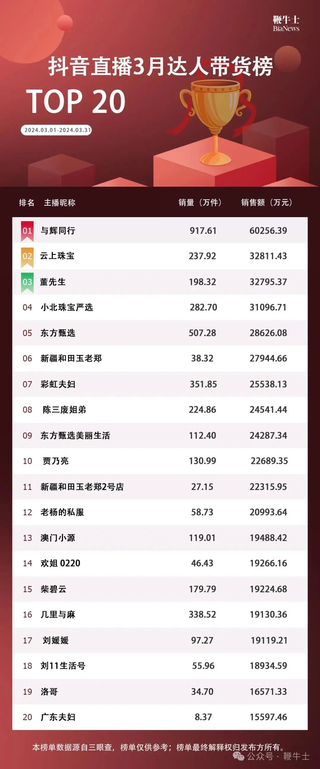 抖音直播3月達(dá)人帶貨榜 圖源:鞭牛士