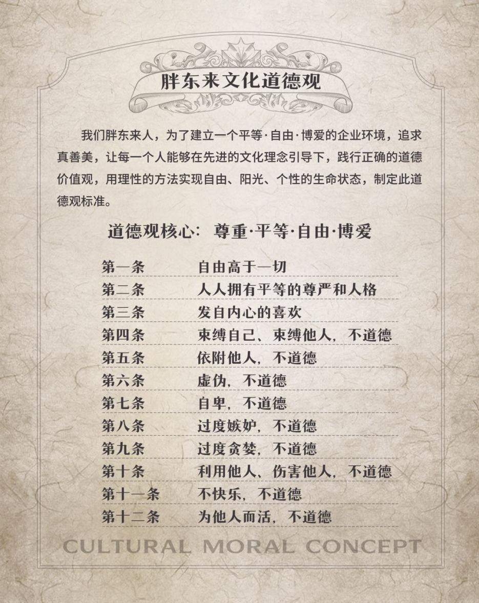 胖東來的企業(yè)價值就是一所學(xué)校,它是一個載體和一個平臺,在這個平臺上傳播先進的文化理念,培養(yǎng)健全的人格,這就是我們的核心。我們的信仰是自由·愛,企業(yè)準(zhǔn)則是揚善戒惡,這個非常重要,揚善就是公平、自由、尊重、信任、勇敢、正義、博愛、節(jié)制;戒惡就是虛偽、無知、自私、自卑、貪婪、嫉妒、束縛等。