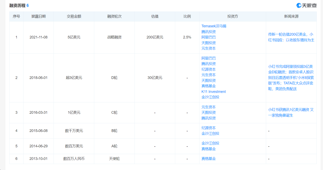天眼查信息顯示,小紅書至今共完成6輪融資,累計融資超9億美元,投資方包括金沙江創(chuàng)投、真格基金、騰訊投資、元生資本、阿里巴巴等。