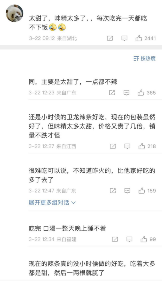 不僅如此,衛(wèi)龍辣條口味偏甜,也被諸多網(wǎng)友認(rèn)為是其不受青睞的重要原因,更有網(wǎng)友吐槽道“衛(wèi)龍你家那個(gè)糖是不是不要錢,使勁放,別叫辣條了,叫甜條吧!”