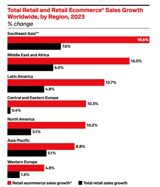 除電商平臺(tái)自建物流搶奪市場(chǎng)份額外,據(jù)InsiderIntelligence數(shù)據(jù)顯示,2023年?yáng)|南亞地區(qū)仍是增長(zhǎng)最快的電商地區(qū),連續(xù)第三年位居全球榜首。該地區(qū)的國(guó)家中,菲律賓、印度尼西亞、馬來(lái)西亞、泰國(guó)和越南的電子商務(wù)市場(chǎng)增長(zhǎng)率均位居前十,增長(zhǎng)率超過(guò)12%。