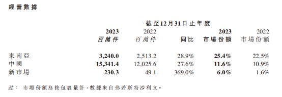 據(jù)極兔上市后向市場(chǎng)交出的首份財(cái)報(bào)顯示,2023年極兔營(yíng)收同比增長(zhǎng)約22%至88.49億美元,包裹處理量較同比增長(zhǎng)22%至188億個(gè)。中國(guó)市場(chǎng)收入同比增長(zhǎng)27.7%至52.29億美元,包裹處理量同比增長(zhǎng)27.6%至153.4億件。