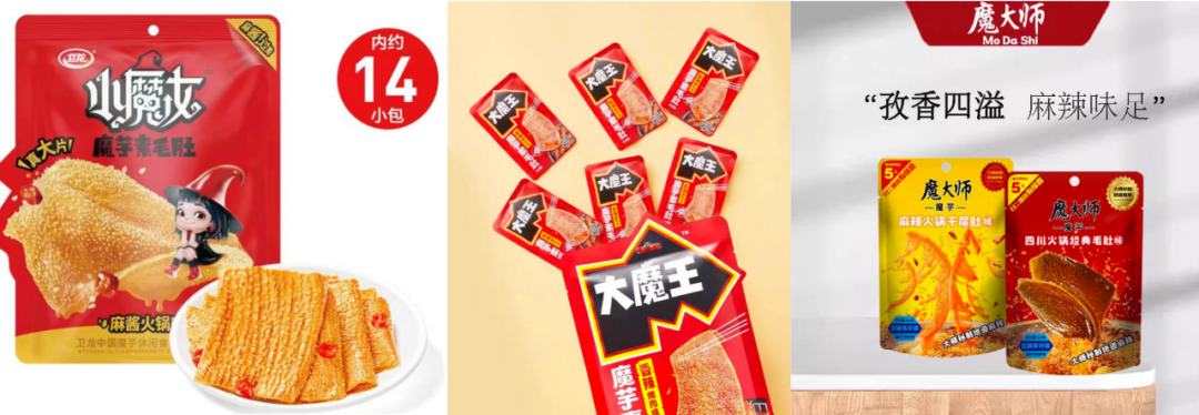 2023年10月19日,衛(wèi)龍發(fā)布全新子品牌“小魔女”,推出香辣火鍋口味魔芋素毛肚。兩天后,10月21日,鹽津鋪?zhàn)庸傩淙伦悠放啤按竽酢蹦в笏孛,同時(shí)推出香辣、麻辣、酸辣、麻醬、烤肉五種口味。不到2周,口味王跨界入局,發(fā)布“魔大師”魔芋素毛肚新品,包括四川火鍋經(jīng)典毛肚味、麻辣火鍋千層肚味兩種口味。