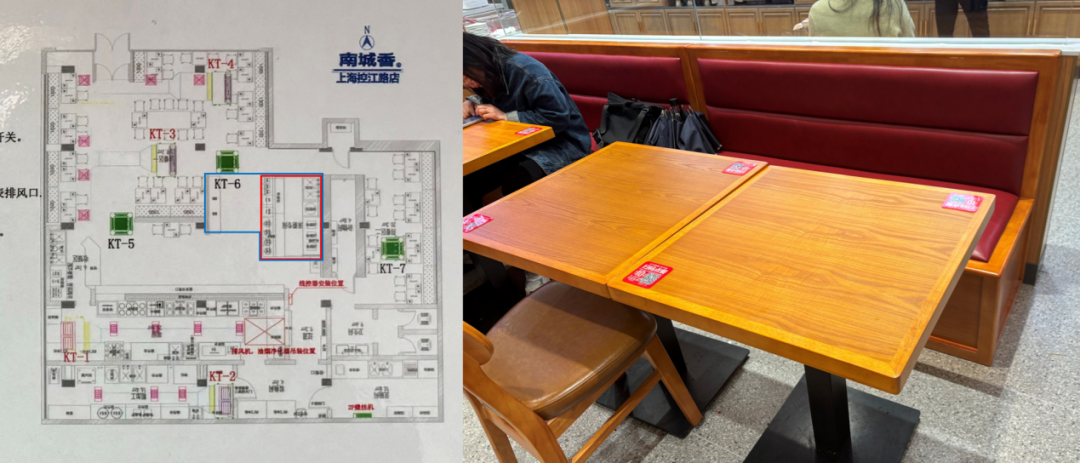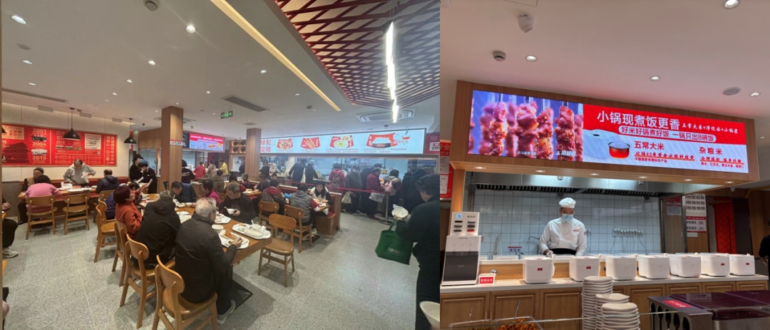 門店還額外設(shè)有獨(dú)立的「米粥專間」。在早餐時段(6:00-9:40),米粥專區(qū)為3元早餐自助的牛奶粥品。而在午餐和晚餐時段,米粥專區(qū)擺滿了電飯煲,強(qiáng)化「早餐3元粥品暢飲」和「米飯小鍋現(xiàn)煮、無限自助」的心智。同時讓動線更加順暢。(見下圖,米粥專間用紅框標(biāo)注、自助區(qū)域由藍(lán)框標(biāo)注)