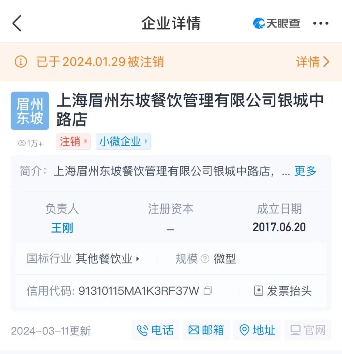但根據(jù)天眼查顯示,這家店已于2024年1月29日被注銷。