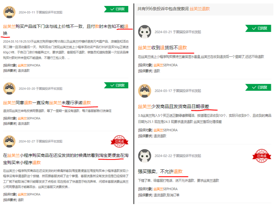 以“絲芙蘭”為關(guān)鍵詞在社交平臺(tái)上搜索發(fā)現(xiàn),其中不乏物流配送慢、價(jià)格過高、柜姐服務(wù)差、退換貨難等吐槽;在黑貓投訴平臺(tái)上,關(guān)于絲芙蘭的退款投訴竟多達(dá)996條。