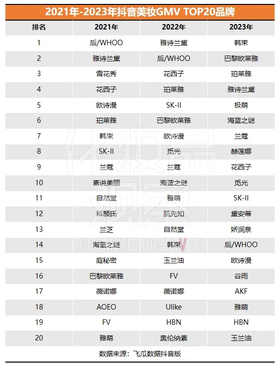在2023年的抖音美妝GMV排行榜中,韓束以33.4億元體量實(shí)現(xiàn)斷層領(lǐng)先,排名前十的國(guó)貨品牌數(shù)量同比也有所增長(zhǎng)。而在此前,占領(lǐng)霸主地位的大多都是國(guó)際巨頭美妝,以2021和2022年為代表,分別是WHOO和雅詩蘭黛。