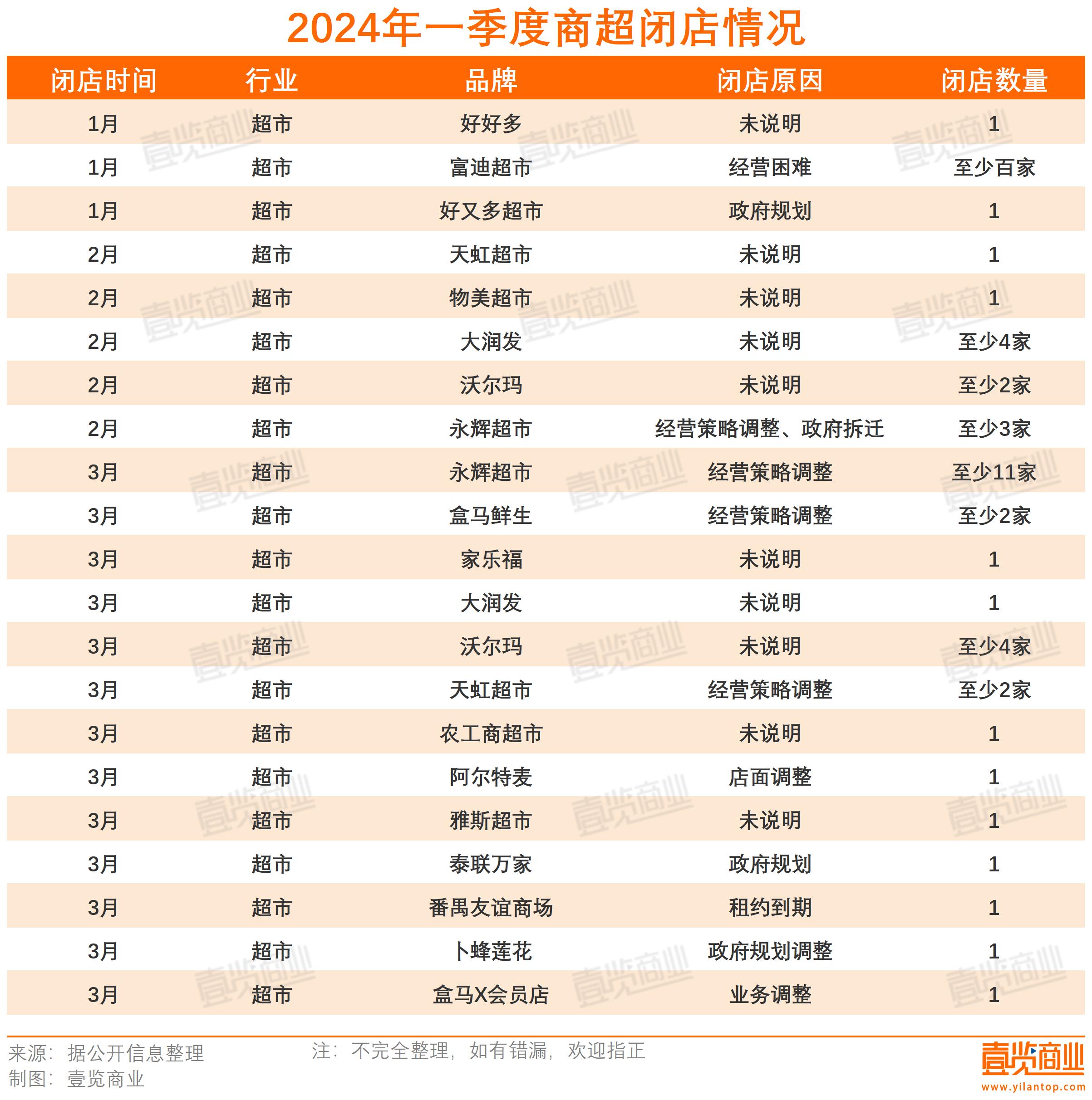 事實上,不僅是華潤萬家,整個商超行業(yè)都不好過。從閉店數(shù)據(jù)來看,據(jù)壹覽商業(yè)不完全統(tǒng)計,除了華潤萬家,今年1季度至少關(guān)閉了140余家超市,涉及17家企業(yè),其中又以富迪超市、永輝超市、沃爾瑪為甚。富迪超市更是關(guān)門百余家,總部向大眾坦言目前公司經(jīng)營困難。