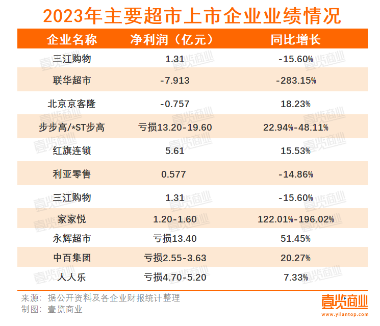 從業(yè)績來看,不少商超企業(yè)形勢嚴(yán)峻。數(shù)據(jù)顯示,11家已公布業(yè)績報告或業(yè)績預(yù)告的超市企業(yè)中,有6家處于虧損狀態(tài),4家處于微盈利狀態(tài),而成績最為矚目的紅旗連鎖,僅取得凈利潤5.61億的成績。