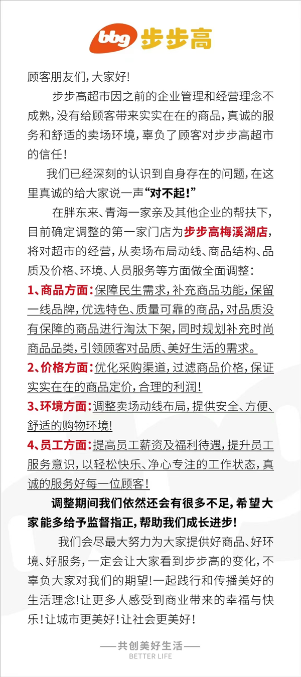 致歉信中寫到:“步步高超市因之前的企業(yè)管理和經(jīng)營理念不成熟,沒有給顧客帶來實實在在的商品,真誠的服務(wù)和舒適的賣場環(huán)境,辜負(fù)了顧客對步步高超市的信任!我們已經(jīng)深刻的認(rèn)識到自身存在的問題,在這里真誠的給大家說一聲‘對不起’!”