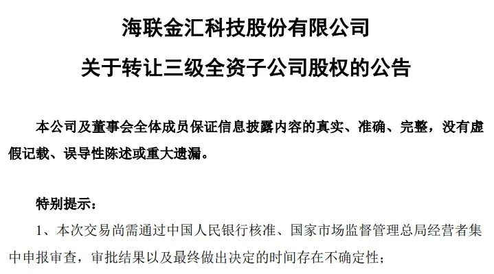 4月3日晚間,海聯(lián)金匯發(fā)布公告表示,計(jì)劃將其全資三級(jí)子公司聯(lián)動(dòng)優(yōu)勢(shì)電子商務(wù)有限公司轉(zhuǎn)讓給天津同融電子商務(wù)有限公司,交易價(jià)格為基準(zhǔn)轉(zhuǎn)讓對(duì)價(jià)7.5億元+交割日凈資產(chǎn)±其他事項(xiàng)調(diào)整金額,參照上海東洲資產(chǎn)評(píng)估有限公司出具的評(píng)估報(bào)告,聯(lián)動(dòng)商務(wù)的全部股東權(quán)益評(píng)估值為13.82億元。