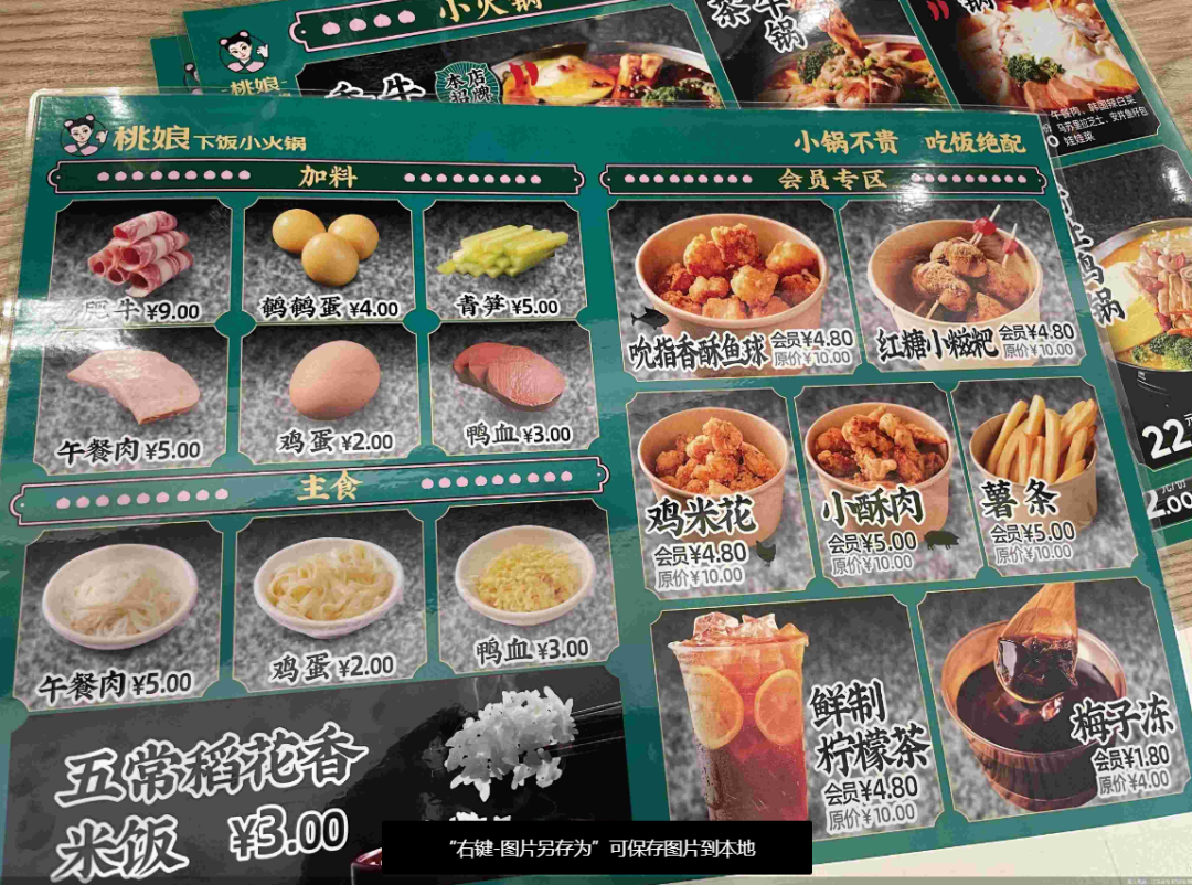 什么是下飯小火鍋呢?從桃娘下飯小火鍋來看,門店有麻辣鴨血豆腐鍋、香辣牛肉鍋、番茄魚鍋、臭豆腐肥腸鍋、豬肚雞鍋等(產(chǎn)品看起來不一定和火鍋有關(guān),倒是和煲仔、干鍋類似),單品價(jià)格在19.8-28元左右,一個(gè)鍋內(nèi)有5個(gè)食材,此外還有雞米花、薯?xiàng)l、奶茶、梅子凍等標(biāo)準(zhǔn)化小吃,價(jià)格在1.8-6.8元區(qū)間,米飯等則是按位收,以自助的形式服務(wù)。在配菜方面,還有肥牛、鴨血、午餐肉、油麥菜等8個(gè)選擇,價(jià)格在3-9元左右。