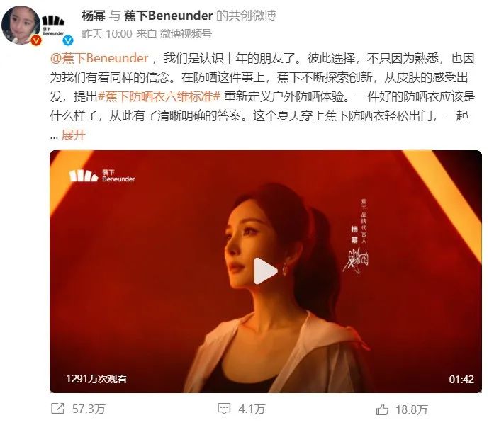 蕉下與楊冪的首支TVC,即為防曬衣六維標(biāo)準(zhǔn)拍攝的,選擇國民度高的明星作為代言人,有助于蕉下提升品牌國民度,也是從細(xì)分市場拓寬到大眾市場最合適的抓手。