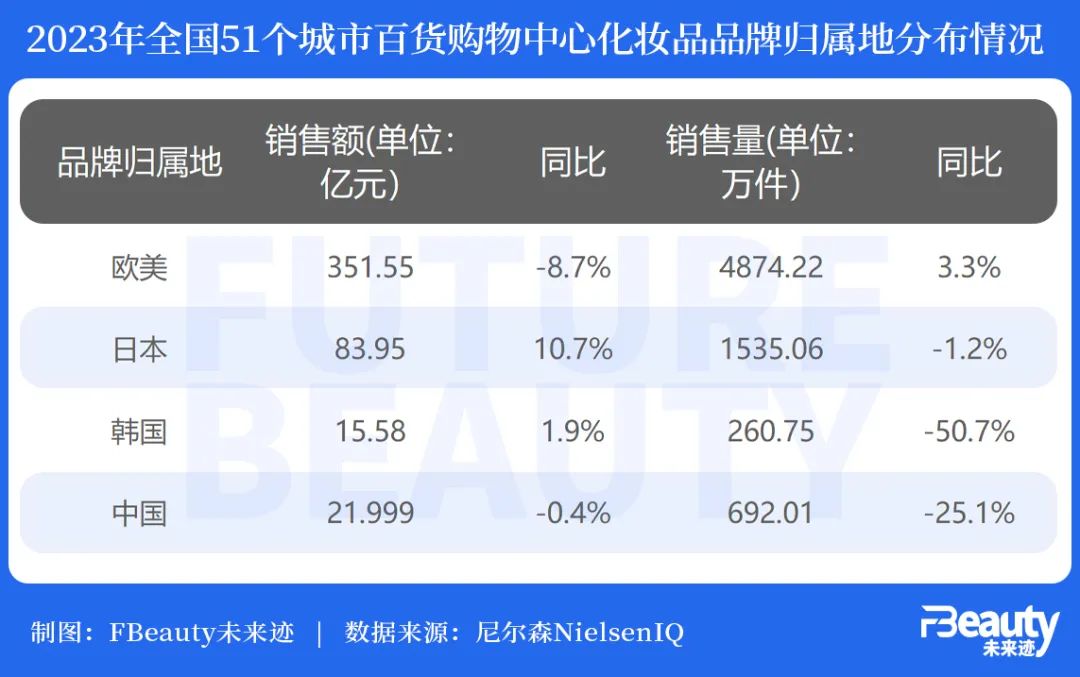 就品牌歸屬地情況看,尼爾森NielsenIQ數(shù)據(jù)顯示,2023年,全國51個城市百貨、購物中心的化妝品銷售中,歐美化妝品全年銷售額同比下降8.7%至351.55億元,但依舊占據(jù)了市場的絕大多數(shù)份額,銷售額占比高達(dá)74.3%。