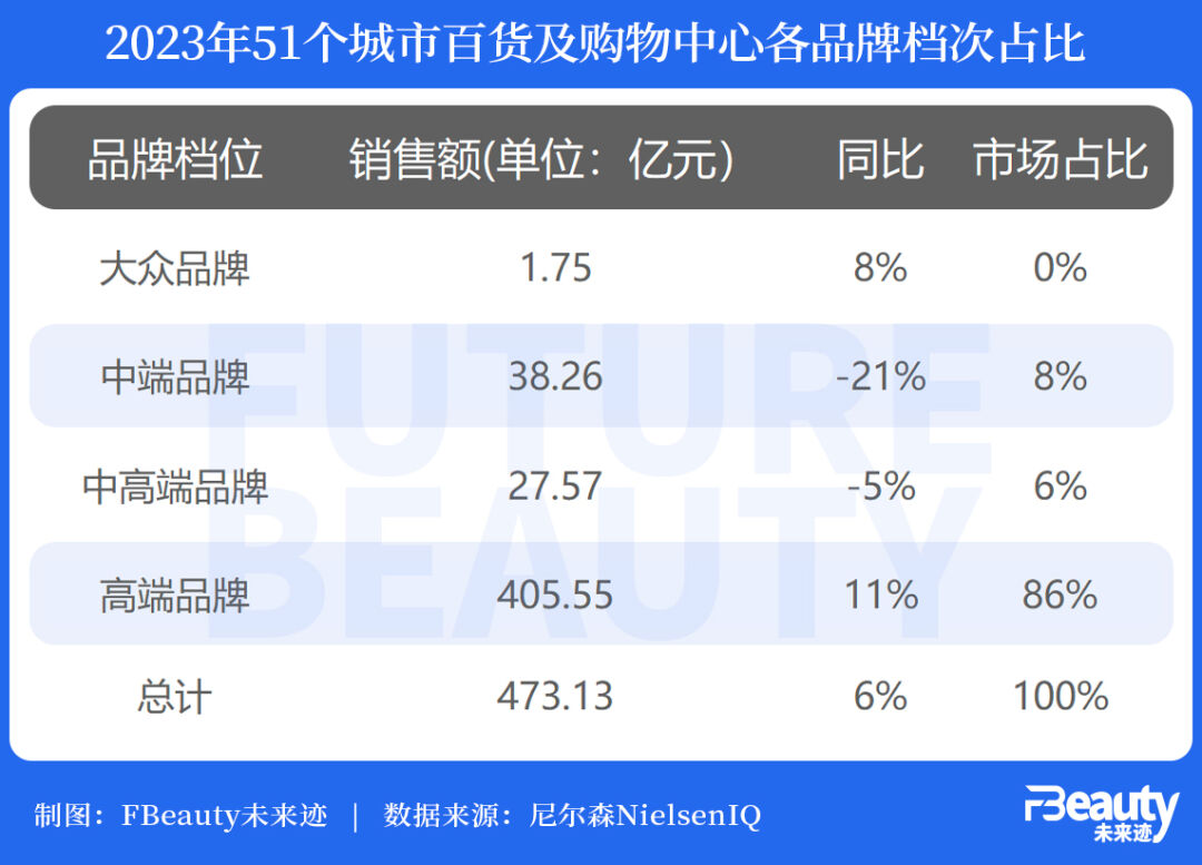 不斷加深的高端化趨勢正直接體現(xiàn)在銷量數(shù)字上。數(shù)據(jù)顯示,在51個城市的百貨及購物中心的總體銷售額中,高端品牌占比依舊最高,以405.55億元的銷售額占比86%,且還有擴(kuò)張之勢,同比上漲了11%。