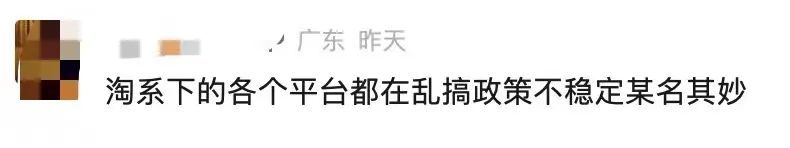 有類似看法的商家并不少,有商家表示,“淘系下的各個(gè)平臺(tái)都在亂搞政策,不穩(wěn)定,莫名其妙。”