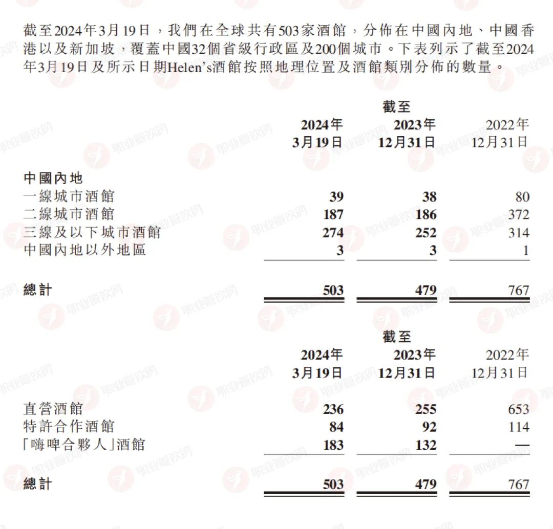 而2023年海倫司旗下直營(yíng)酒館、特許合作酒館數(shù)量分別為255家、92家,比2022年的653家、114家同比下降60.95%、19.3%。