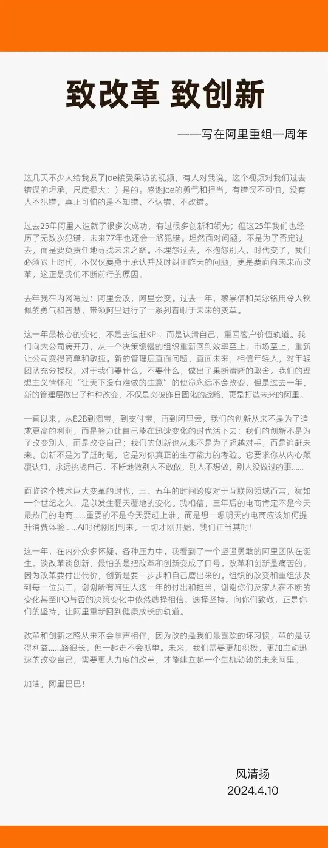 4月10日,馬云以花名“風(fēng)清揚(yáng)”在阿里巴巴內(nèi)網(wǎng)發(fā)表《致改革 致創(chuàng)新》的內(nèi)部信。信中,他不僅高度肯定了現(xiàn)任董事局主席蔡崇信和CEO吳泳銘組成的新管理層的變革勇氣,更對(duì)阿里這一年的改革成果給予了認(rèn)可,稱(chēng)阿里已重回健康成長(zhǎng)軌道,并支持繼續(xù)改革。