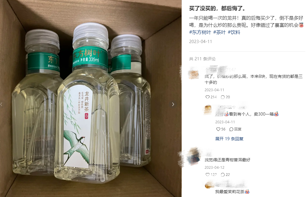 如今變了,再沒有比東方樹葉更備受關(guān)注的飲料了。東方樹葉在4月1日售賣5萬箱龍井新茶時,直接在社交平臺上炸開了鍋,17小時的售罄速度遠(yuǎn)遠(yuǎn)趕超上一年的一周。