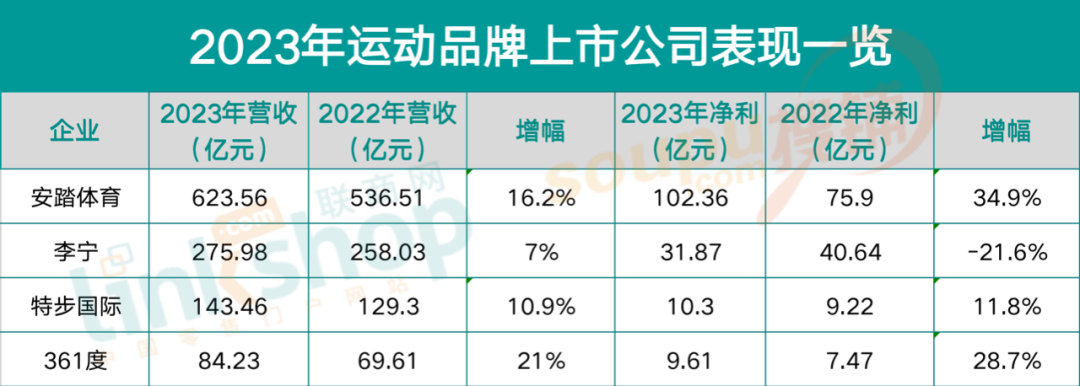 對(duì)于安踏來說,過去的2023年當(dāng)然是一個(gè)「肥年」,623.56億營(yíng)收、102.36凈利潤(rùn)都超過了李寧、特步、361度之和,而后三者的營(yíng)收、凈利潤(rùn)分別為275.98億、31.87億;143.46億、10.3億以及84.23億、9.61億。