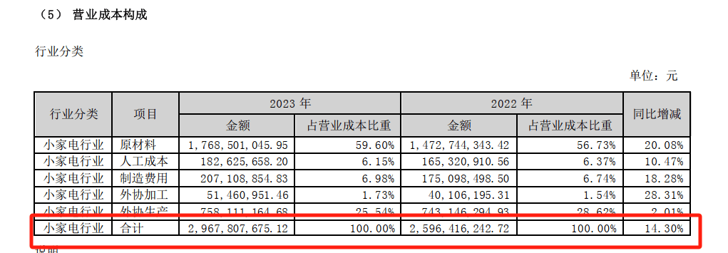 此外,小熊電器壺類廚房小家電毛利率下滑1.31%,生活小家電毛利率下滑0.62%。這背后,公司主營(yíng)業(yè)務(wù)的成本增加了14.3%;增長(zhǎng)最明顯的當(dāng)屬原材料,同比增長(zhǎng)20.08%。