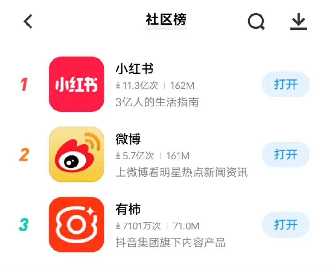 由于網(wǎng)賺運(yùn)營模式,其發(fā)展也較為迅猛,根據(jù)七麥數(shù)據(jù)顯示,上線近一年時(shí)間,“有柿”APP在安卓端的下載量達(dá)到了約3.6億次,在VIVO應(yīng)用商店的社區(qū)榜中僅次于小紅書和微博,排名第3。