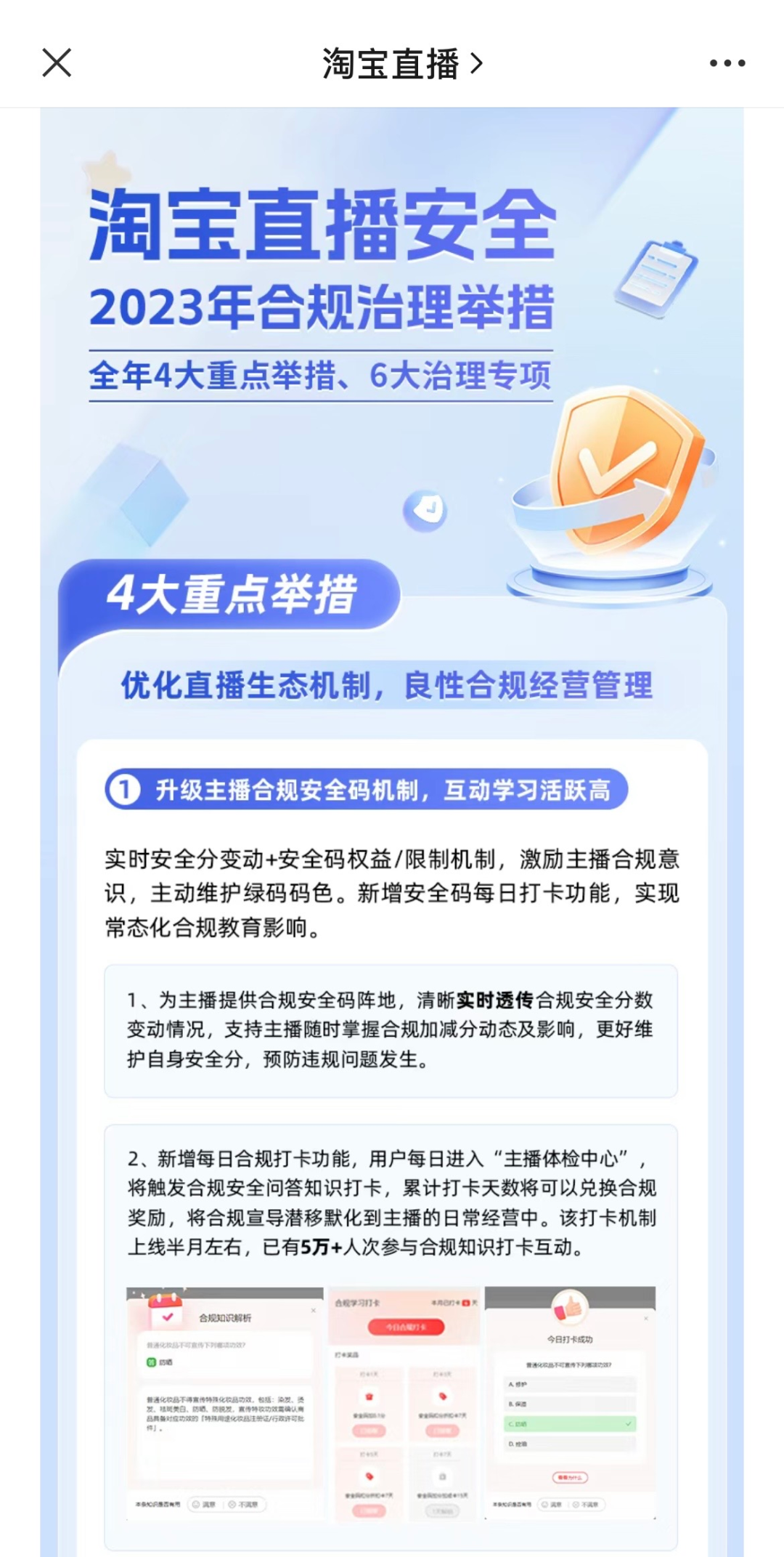 而去年淘寶直播在合規(guī)治理上推出4大重點舉措、6大治理專項。據(jù)介紹,4大重點舉措分別是升級主播合規(guī)安全碼機制、推出“主播糾錯卡”功能、假冒品牌及材質(zhì)劣質(zhì)類治理專項、主播處罰清晰化及預檢工具升級。