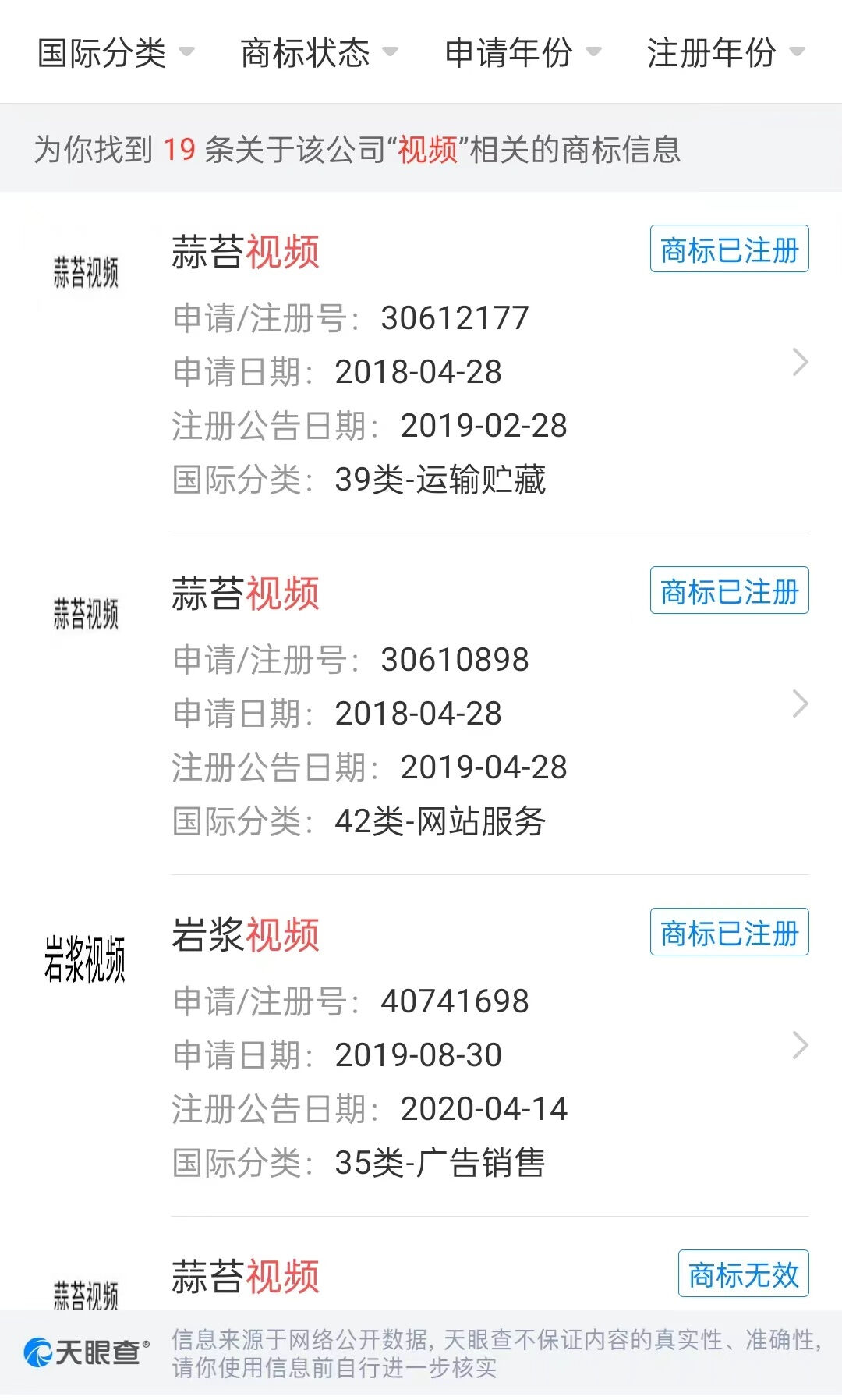 天眼查數(shù)據(jù)顯示,京東早在2018年注冊了“蒜苔視頻”“巖漿視頻”等6個品牌商標,但相關(guān)產(chǎn)品也一直沒有動靜。
