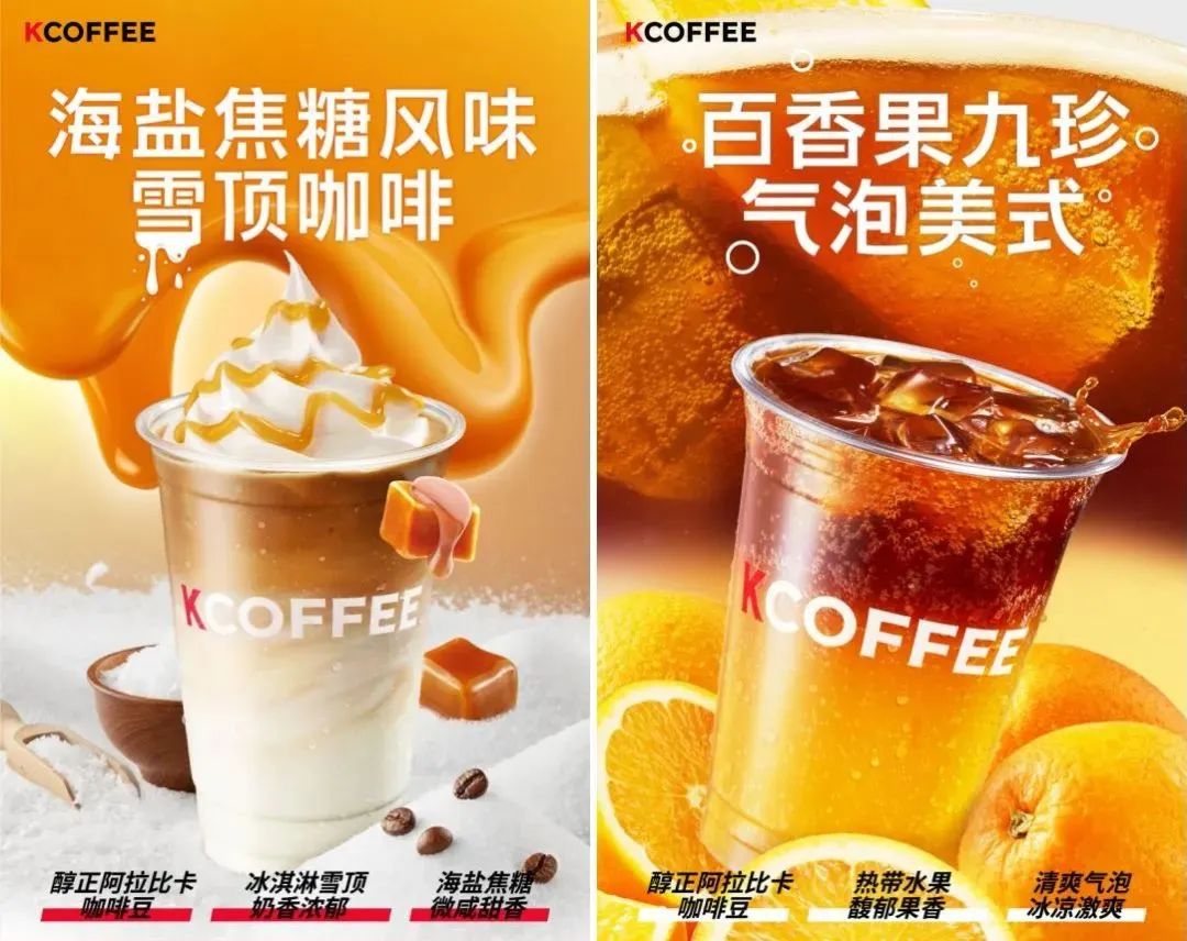 肯德基曾經(jīng)出現(xiàn)過兩款爆款飲品,分別是雪頂咖啡和九珍果汁。而KCOFFEE在這兩款出圈產(chǎn)品的基礎上進行升級,打造出了海鹽焦糖風味雪頂咖啡和百香果九珍氣泡美式。