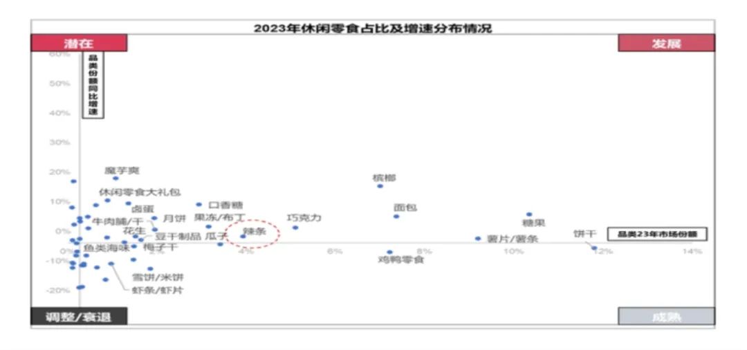 2023年,辣條在休閑零食市場中占據(jù)了3.94%的份額,只有餅干、糖果、薯片等傳統(tǒng)熱門休閑零食市場份額的三分之一不到。同比增速也呈了負(fù)數(shù),為-1.70%,甚至比不上口香糖等類目的同比增速。