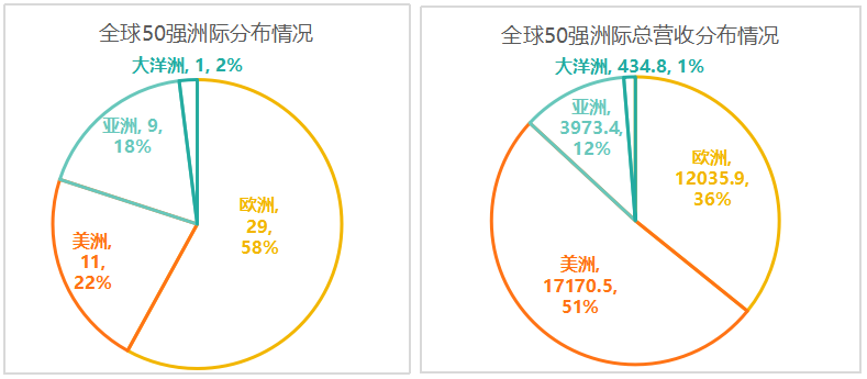 50強企業(yè)中,國際化也是其普遍特征,國際業(yè)務(wù)營收總體占比33.7%(國際業(yè)務(wù)營收/總營收)。