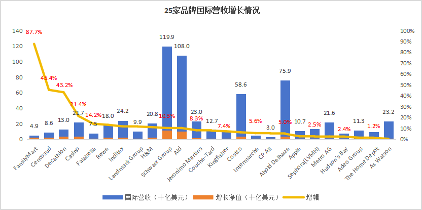 增幅最高的前三位為全家(FamilyMart)增87.7%、智利Cencosud增45.5%、法國迪卡儂(Decathlon)43.2%;