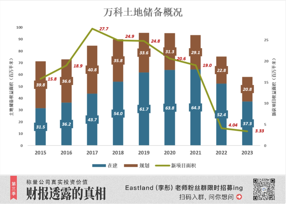 2023年,新增項目權(quán)益面積僅333萬平米,年末土地儲備5810萬平米(其中在建工程3730萬平米);