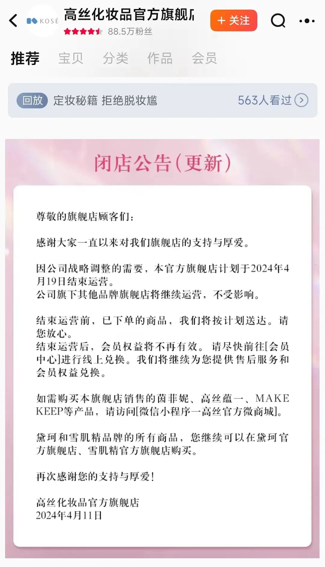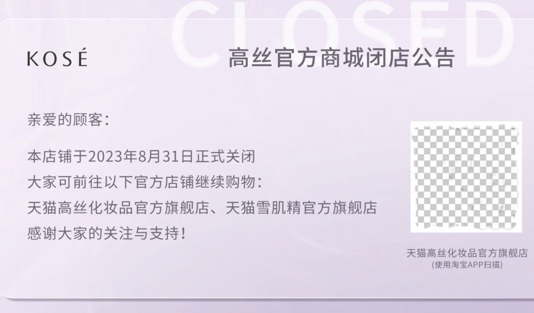 近日,天貓高絲化妝品官方旗艦店首頁掛出閉店公告稱,將于2024年4月19日結(jié)束運營,在此之前下單的貨品還將按計劃送達。店鋪運營結(jié)束后會員權(quán)益也將失效,需用戶盡快前往會員中心進行線上兌換。