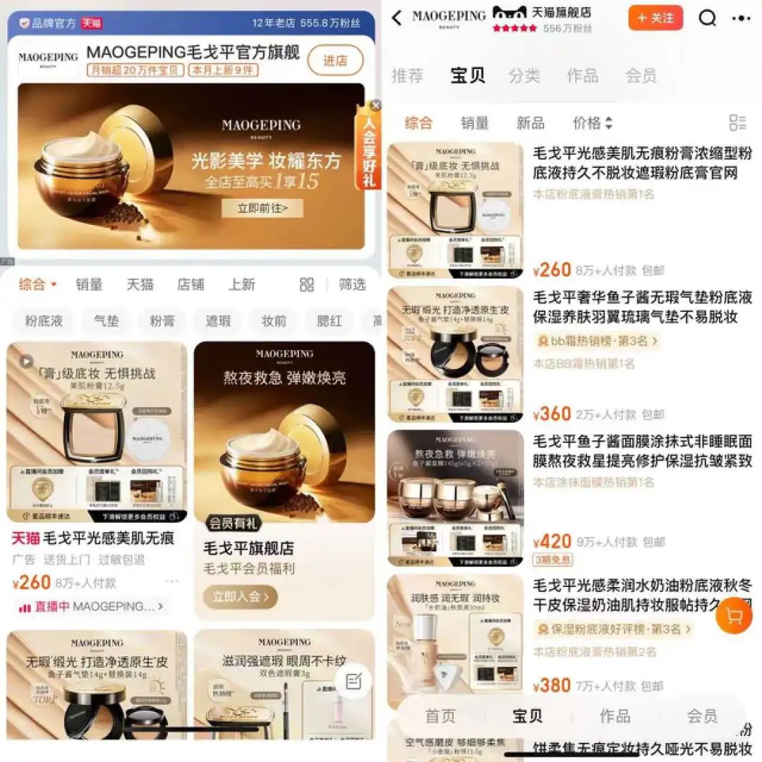 圖:毛戈平的天貓店鋪擁有近556萬粉絲 來源:天貓 《聽筒Tech》截圖