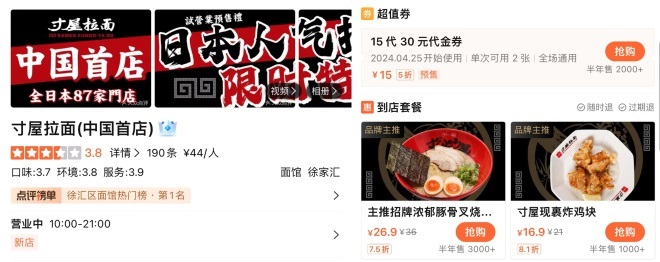 第一波消費(fèi)者主要是嘗鮮而來,生意還算不錯(cuò),為了維持開業(yè)初期的人氣,寸屋拉面通過點(diǎn)評(píng)平臺(tái)預(yù)售15元代30元的代金券,從4月25日開始使用,每次消費(fèi)最多可用兩張。