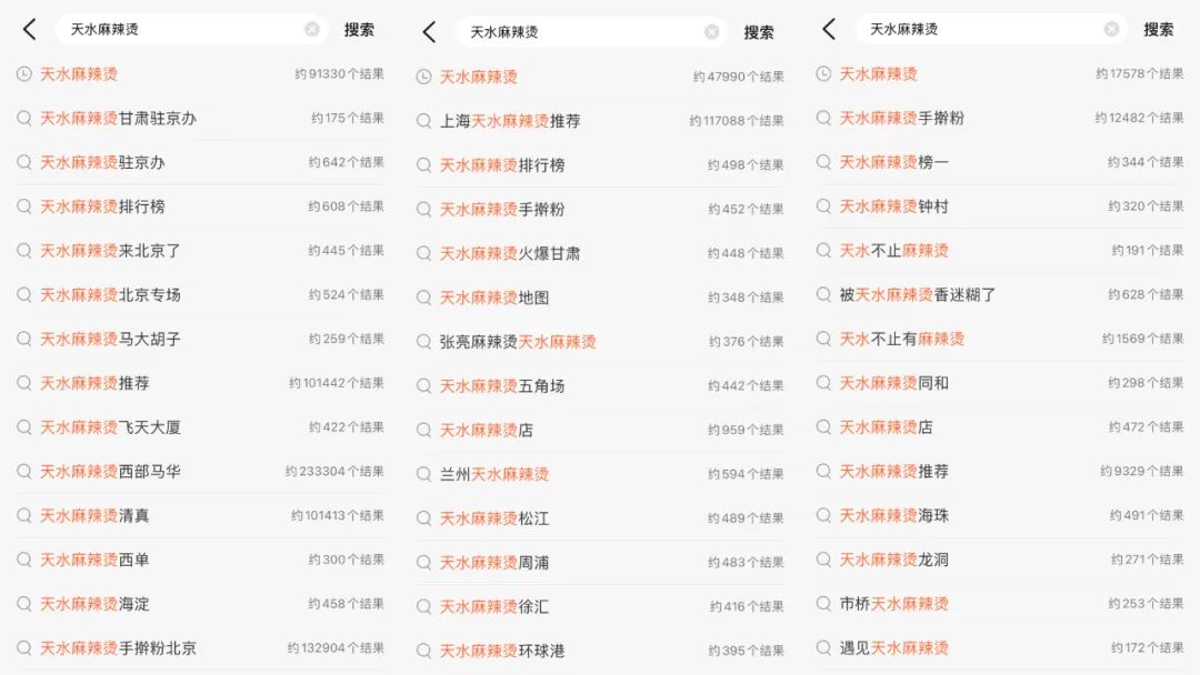 據(jù)美團(tuán)、大眾點(diǎn)評(píng)數(shù)據(jù)顯示,截至3月31日,全國(guó)地區(qū)大眾點(diǎn)評(píng)上收錄的天水麻辣燙商戶數(shù)近千家。在大眾點(diǎn)評(píng)上搜索“天水麻辣燙”,與之相關(guān)的結(jié)果北京9萬(wàn)余條,上海4.7萬(wàn)余條,廣州達(dá)1.7萬(wàn)余條。