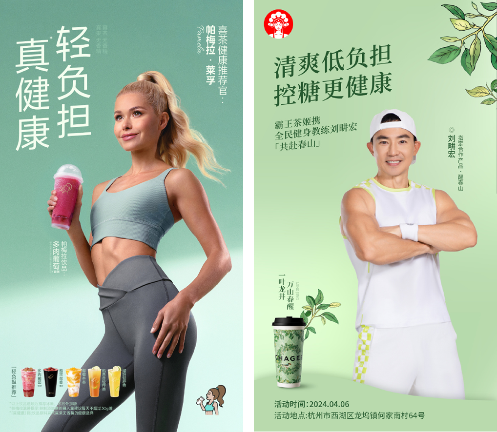 相比之下,作為喜茶最大競爭對手之一的霸王茶姬,應(yīng)對“茶飲健康化”時的步調(diào)則顯得有條不紊。先是為科學(xué)控糖推出GI值標(biāo)識;隨后又為新品“醒時春山”請到劉畊宏叫板喜茶的推廣官帕姐。