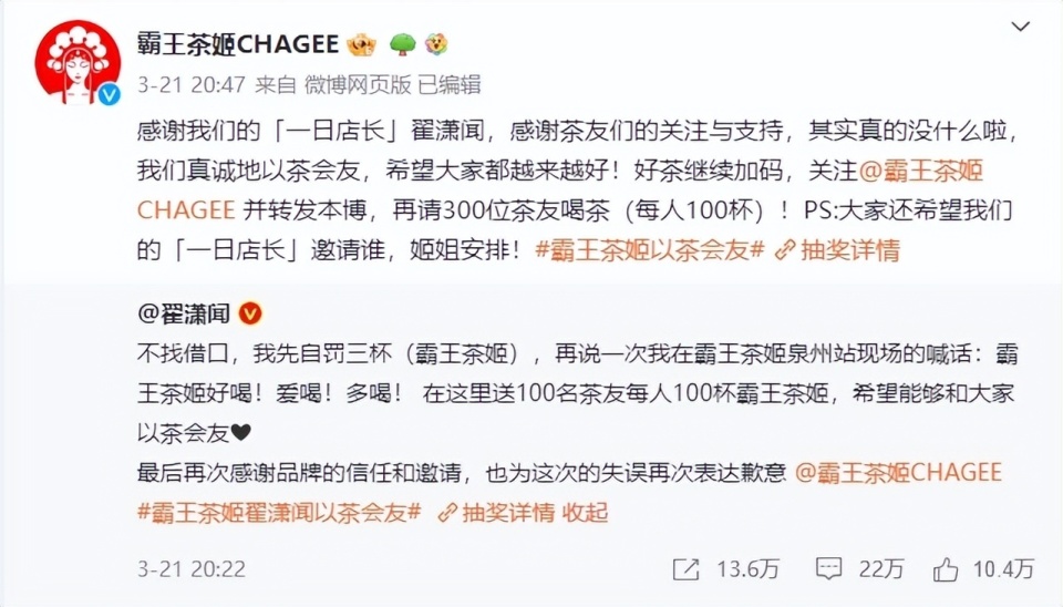 今年3月21日,在霸王茶姬舉行的一場線下活動中,被邀請來為品牌站臺的男星翟瀟聞,甚至當(dāng)場喊出了“大家可以多多支持茶顏悅色”,令現(xiàn)場一片嘩然;當(dāng)晚霸王茶姬在官微轉(zhuǎn)發(fā)了翟瀟聞的道歉,并表示“其實(shí)真的沒什么”。