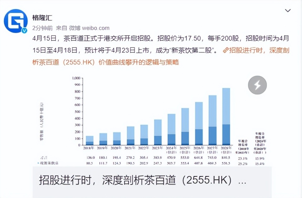 彭博社此前報(bào)道中提到的6家計(jì)劃海外上市的茶飲品牌,目前已有蜜雪冰城、茶百道、古茗、滬上阿姨4家遞交了港股招股書;其中茶百道已通過港交所聆訊,預(yù)計(jì)4月23日于港交所主板掛牌上市,發(fā)售價(jià)為17.50港元/股。