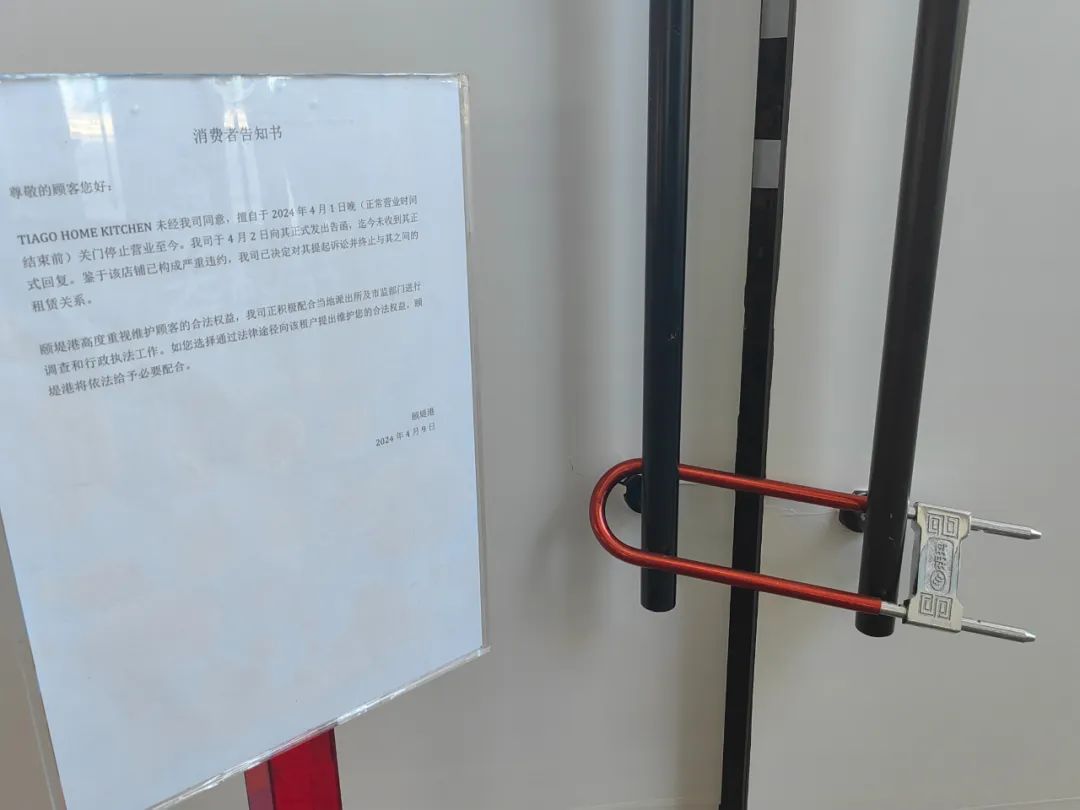 視覺(jué)上看起來(lái),這家店似乎沒(méi)有倒閉,門頭干凈整潔,品牌logo清晰醒目。不過(guò),門口貼了一張以商場(chǎng)口吻發(fā)布的告示,表示“Tiago未經(jīng)我司同意,擅自關(guān)門停業(yè)”。
